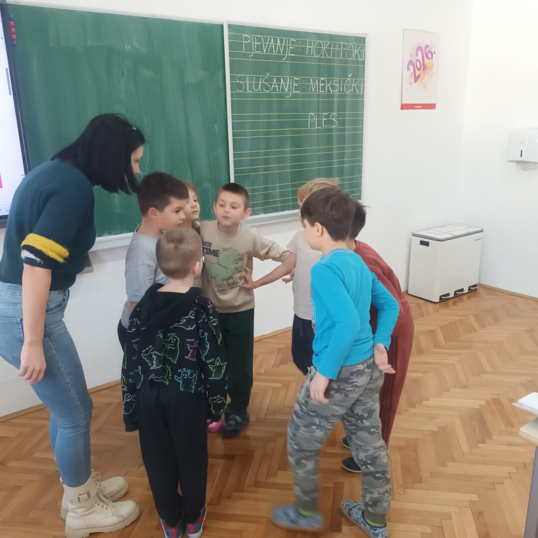 Zajedno s učenicima proveli smo razigran i zabavan sat ispunjen pjevanjem i plesom. Zaplesali smo Hoki Poki, ali ne sasvim klasično, svatko je dodao vlastiti pokret i osobni štih, pa je nastala zajednička koreografija obogaćena kreativnošću svakog učenika.