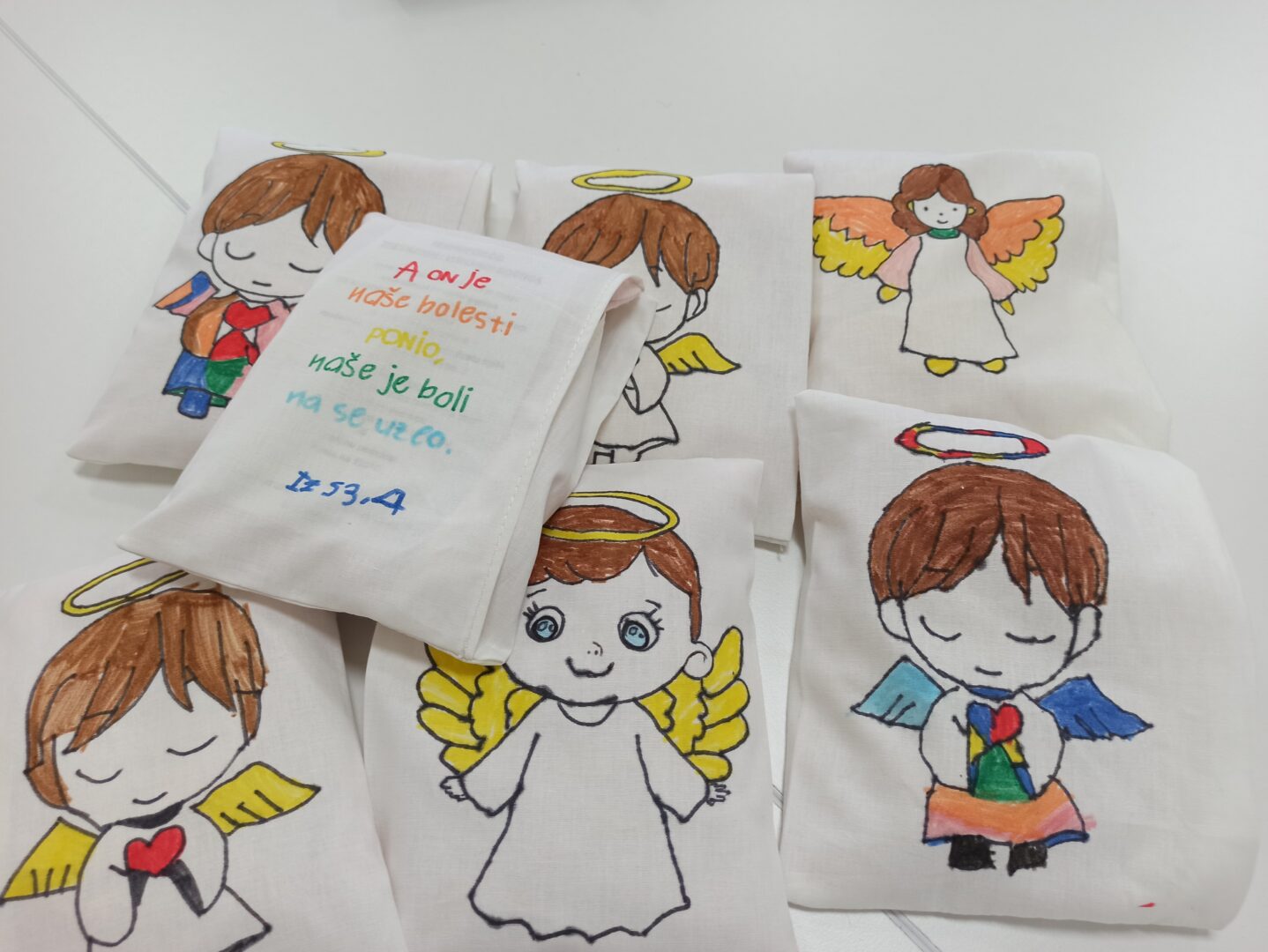 Kako bi unutarnja vrećica ostala čista, valjalo je napraviti vanjsku navlaku koju smo sami ukrasili anđelom, a natpisom se podsjetili tko je Onaj koji naše boli uze na se.